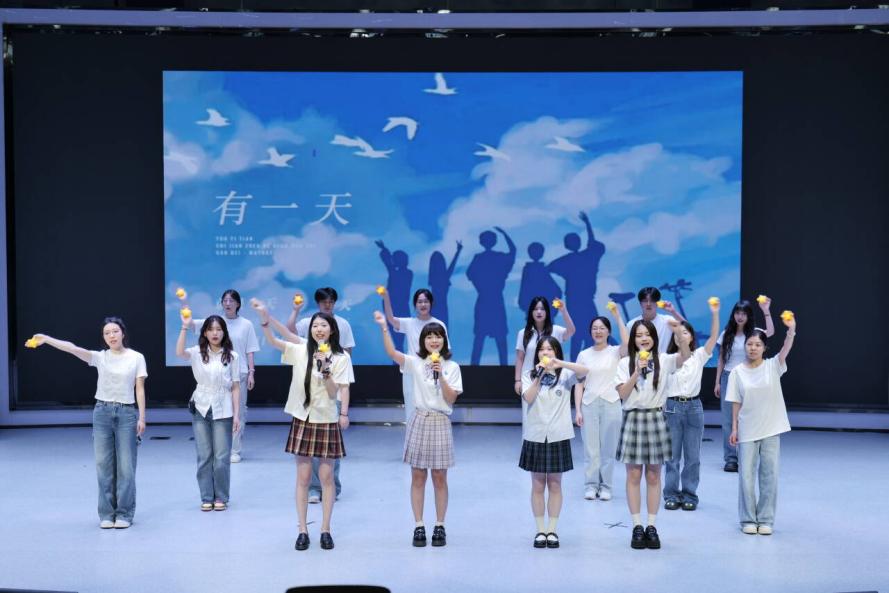 “时间都停了,我们都回来了!”终场合唱《干杯》以温暖的歌声唱响了青春纪念册,温情的旋律引发了全体师生的共鸣。曲终之际,150余名演职人员齐聚舞台中央,在流转光束中深情谢幕。笑脸与泪光交织,见证着大家汗水凝结的荣光。