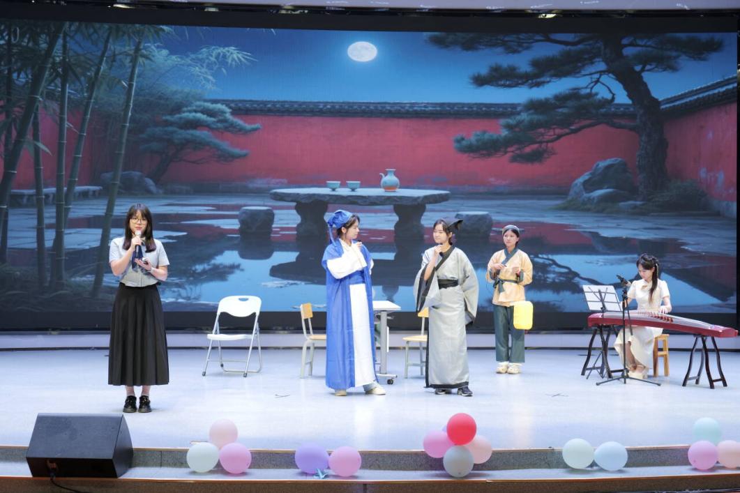 汇演现场笑声不断,“笑”果满满。小品《敲想挖到你》将“盗墓”与“修地铁”两个时空错位的场景脑洞融合,用啼笑皆非的冲突演绎出一场关于“传统”与“现代”的趣味对话。四位同学身着花色被子化身“软体萌物”演绎《被子舞》,让日常用品变成了充满童趣的舞台魔法。在配音秀环节,跨班协作的同学们化身“声线千面人”,用中英文双语演绎打破次元壁,让观众在“耳朵的旅行”中感受语言艺术的极致魅力。创意走秀《职业盲盒:开出全是惊喜》 更是将“笑果”与“巧思”拉满,这场充满自嘲与调侃的走秀,既是对专业出路的幽默解构,也藏着对未来的热血期待。